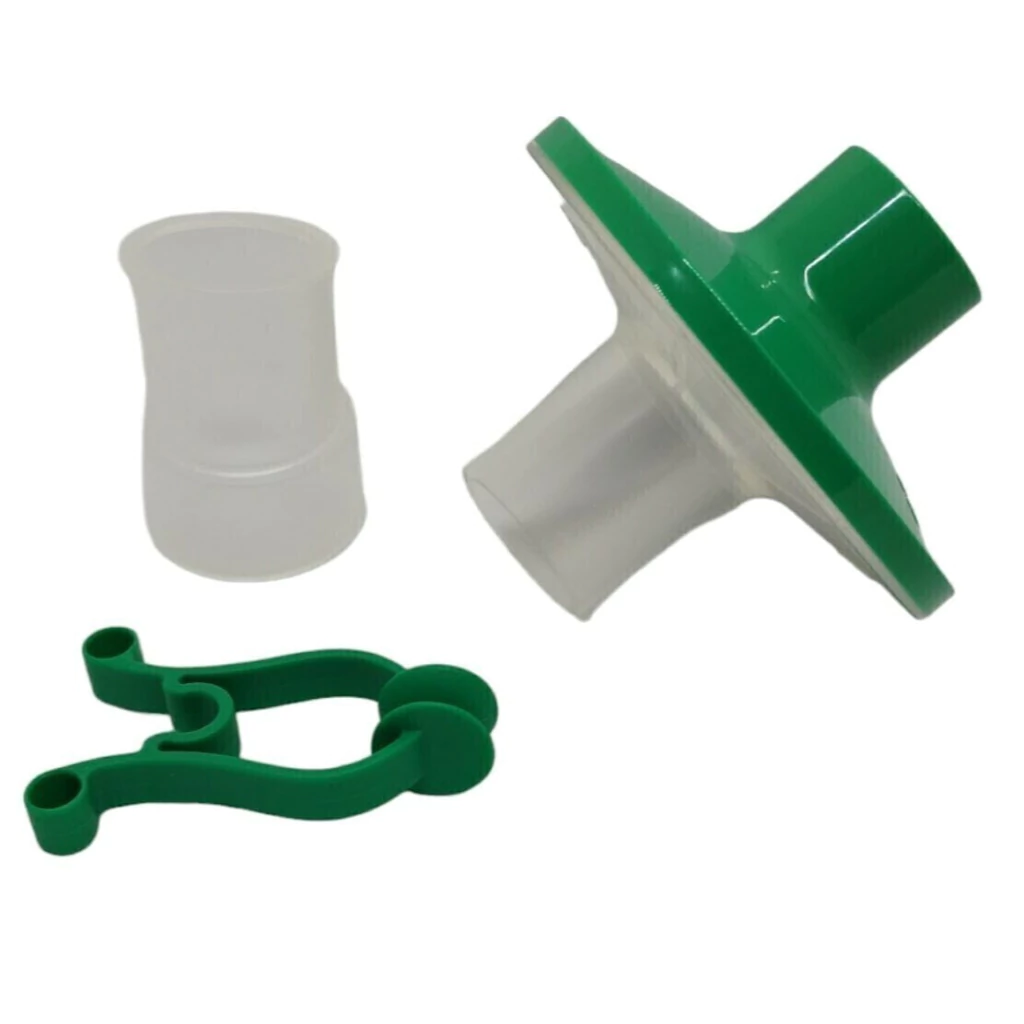 Viene con boquilla para paciente y pinza para nariz, todo en envase sellado.
