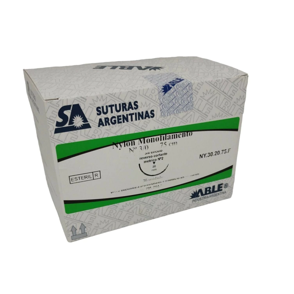 SUTURA NYLON MONOFILAMENTO ABLE Nº 3/0 CON AGUJA DE 20 MM, 3/8 CÍRCULO, REVERSO CORTANTE Y HEBRA DE 75 CM