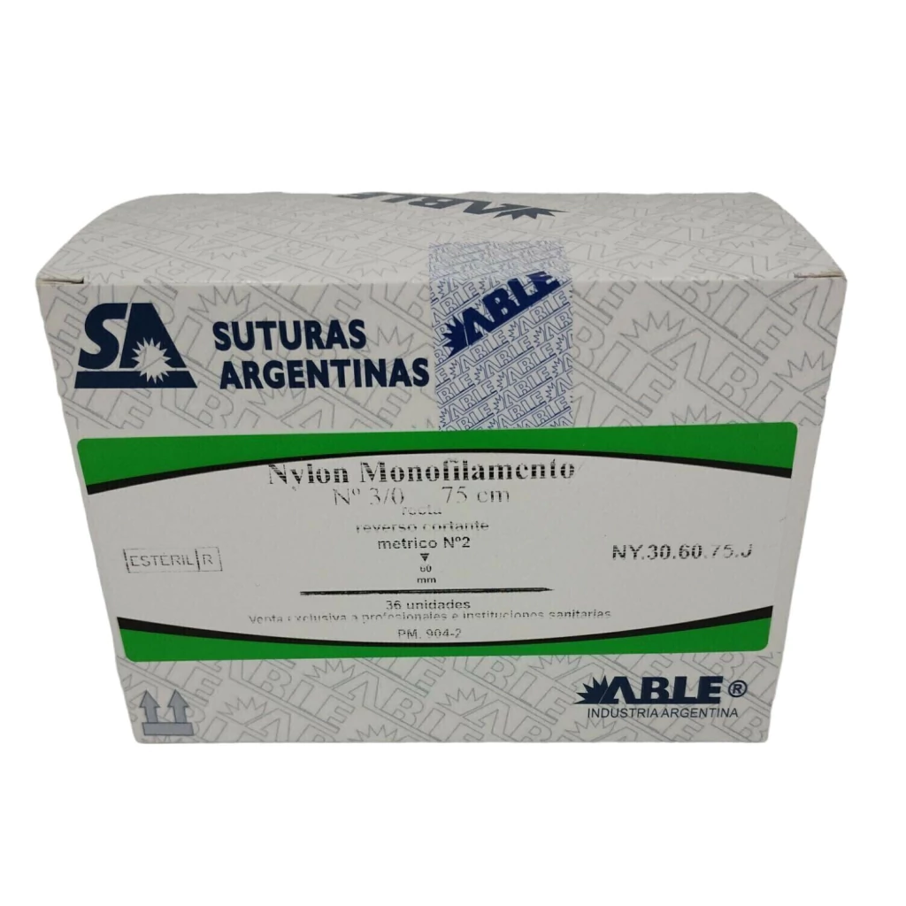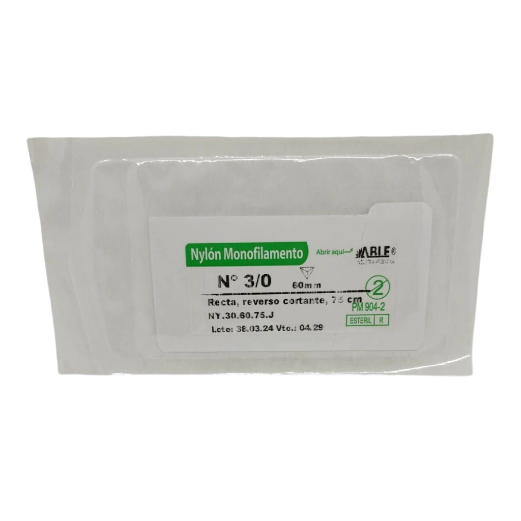 SUTURA NYLON MONOFILAMENTO ABLE Nº 3/0 CON AGUJA DE 60 MM, RECTA, REVERSO CORTANTE Y HEBRA DE 75 CM